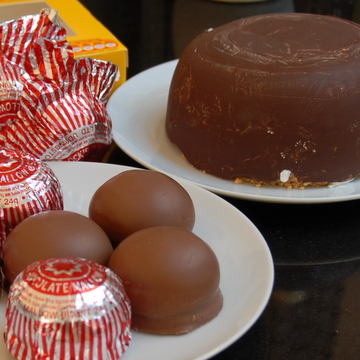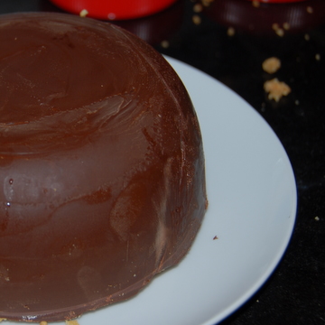 In the back of my mind I remembered seeing jars of marshmallow at the deli and sure enough you can buy such stuff called ‘Fluff’. Now all I needed was to build a dome shape of chocolate – and I suddenly thought of the ice-cream bombe mould buried in one of my cupboards. But is there a way to paint on melted chocolate and then remove it whole from the mould? As a first attempt, I lined the mould with cling-film. Mike expressed doubt at this method and he was right – there is no way you can spread chocolate on cling-film without it moving and sticking to itself. Retrieving as much chocolate as I could, I went for method two: greasing the mould with butter and painting the chocolate straight on. This worked, but I knew that getting the chocolate out of the mould would be tricky. Freezing it, then dipping the mould in hot water didn’t work, but putting it in the fridge until semi-hard and loosening the chocolate with a knife around the edges did.