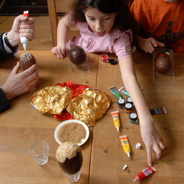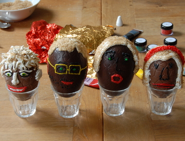 My hair, nicknamed The Bush (thanks dad) was made by dipping the icing in Demerara sugar (brown stuff). They look good and it's something different to do with your chocolate eggs (before eating them of course). Joe |