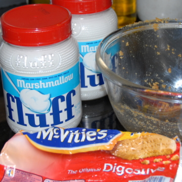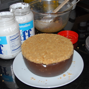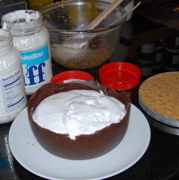 Great joy. My challenge was nearly over. As I filled the centre with Fluff, the odd crack appeared in the chocolate and began to get alarmingly bigger as I placed the biscuit crust on top.