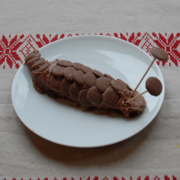 Joe: The Armadillo Thing (my mum thought was a slug!) As I wandered around the house looking for food I stumbled into the kitchen and came across Carla and Emma making a hedgehog cake. I sidled over to ‘borrow’ a slice they weren’t using but upon seeing what they’d made I thought I’d have a go myself. My first idea was to construct a dolphin with the help of their delicious icing but I then veered off in a completely different direction. The new idea started out as an armadillo but once I had plated its back with chocolate buttons like scales I realised that I had run out of buttons and the rest of the cake was in crumbs. Thwarted, I had to make do with the final two buttons stuck on cocktail sticks like big googly eyes.