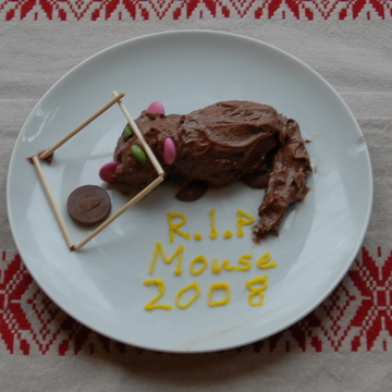 The tail was sculpted out of icing when it came out of the fridge, and Mike built the outline of the trap over the forehead of our mouse, using four cocktail sticks stuck together with icing to glue it to the plate. Joe experimented with cherry skin and frozen cranberry juice to make some fake blood to stick on the forehead of the mouse. We rejected these interventions on grounds of sick taste. Lastly, Carla carefully chose the label wording for the recently deceased mouse effigy, and elegantly wrote ‘R.I.P. MOUSE 2008’ in yellow icing.