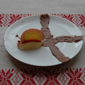 Meantime, Carla chose pink Smarties for the ears and nose, and green Smarties for the eyes, so I cut these in half for her on a wooden chopping board. Several other Smarties were sampled in the selection process – it is very important to taste the materials you are working with to make sure you have the correct ingredients. Next we cut about 20 chocolate buttons in half to use for the legs. It turned out that we only needed four half buttons, so the other 36 half buttons had to be eaten to leave the chopping board neat and tidy for the next user.