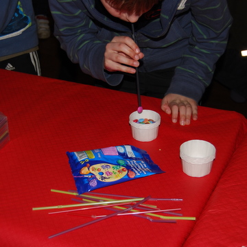 The first used Smarties, some straws and a container. The aim was to suck as many Smarties up using the straw and dropping them in the container as you could in 1 minute. The prize was the container of Smarties you managed to get. Most people got around 20, but some were nearer to 40!