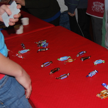 The third game required just a box of Celebrations or similar assorted chocolates. One of each type is placed on the table. Then one of them has to be chosen as the ‘stop’ chocolate. The person in charge of the game chooses this, making sure that the person who is going to play does not know the choice. The player then starts to pick up the chocolates in whatever order they wish to, keeping each chocolate until they pick up the ‘stop’ one which ends their turn. You either walk away with 0 or a handful of chocolates depending on your luck.