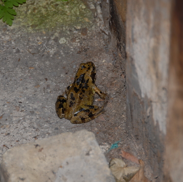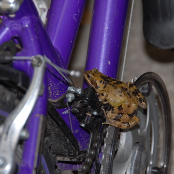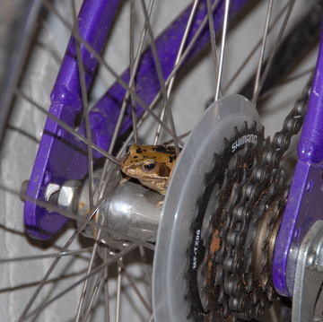 As Joe lent down the frog gave a very athletic jump to land on the inside of the bicycle wheel and was only coaxed off by gentle, encouraging prodding.