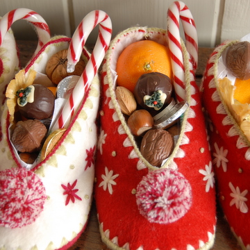 The small gifts in the shoes are a build-up to the baskets full of presents that arrive on the doorstep on the 5th, accompanied by showers of sweetie-sized ginger nuts thrown into the room by an unknown hand in a long black glove. Often, there is also a proper visit from St Nicholas himself, who calls the children to him one by one to discuss their behaviour and praise their achievements of the past year, reading from notes in his big, red book. He will always ask the children to sing a couple of the old St Nicholas songs they have been taught by their parents and at school.