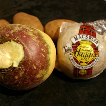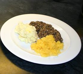 Haggis is a mixture of minced lamb offal, beef fat, oatmeal, water, onion, salt, pepper and spices traditionally bound inside a sheep's stomach. Neeps are mashed Scottish turnip (swede to the English) and tatties are mashed potatoes. At a Burns Supper, a starter may be cock-a-leekie soup (chicken and leek broth) or cullen skink ( a delicious smoked fish and cream soup). For pudding there may be sherry trifle, cranachan (a thick creamy mix including toasted oatmeal, whipped cream, rum or vanilla, sugar and fresh berries such as raspberries). Cheese and oatcakes and coffee would follow and whisky would be offered throughout the meal.
