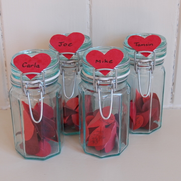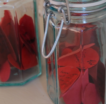 Tamsin: With all the empty jars I have and no jam at this time of year to fill them up, I thought we could use a few for Valentine’s Day and fill them with little snippets of ‘love’ for each member of the family. I had forgotten though that expressing ‘love’ is not always easy and takes quite a lot of hard work in our family, but I ploughed on with my idea. I cut out an optimistic 50 red hearts and then called everyone to write something on each one for each member of the family. Every heart contained the end to the sentence ‘I love...’ thinking of a trait, action, feeling etc. Mike, emotionally deprived from his 1960s' upbringing, squirmed for 15 minutes and managed to write one for each person. Carla relished the opportunity, having no qualms about expression, but from her giggles I am unsure what we can expect. Joe in his teenage ‘life is so exhausting and my head is so heavy’ state wrote a couple before yawning and settling down to a book. I scribbled away as if it was an exam I had to pass, making sure I'd given equal weight to each member of the family so no favouritism was shown.