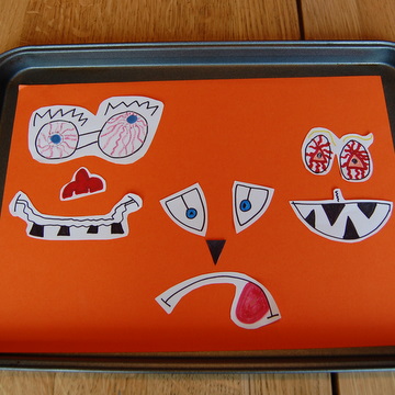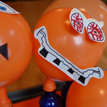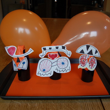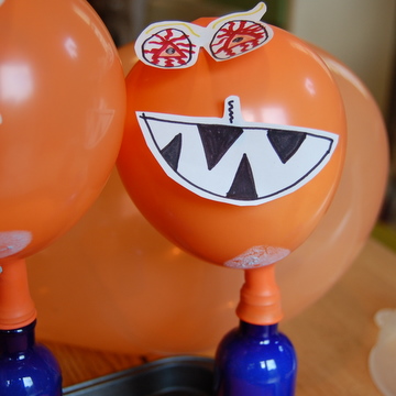 Jane: As a gruesome welcome to trick or treaters this year, we wanted to try out something new and a bit different – some gorgeously gassy grotesques. The idea of three expanding Halloween balloon monsters lined up in a row, wobbling and burping horribly before our eyes, seemed very enticing. So Edie drew some monstrous mouths, eyes and noses – enough for three faces (see below) – and cut them out. We found three small bottles, some orange balloons, and got out the bicarbonate of soda and vinegar ready for the old explosion trick