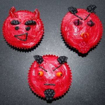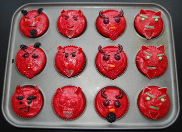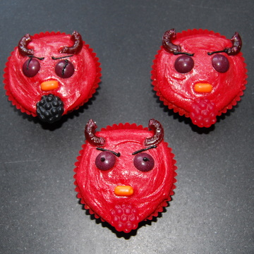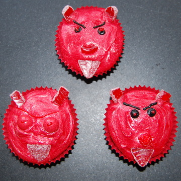 Tic-tacs made good eyes and a tube of black icing was best for the wicked eyebrows. The cakes would make good trick and treat gifts but the best fun is creating the different devil faces. If you need to entertain some devilish kids, decorating these could keep them amused for quite a while.