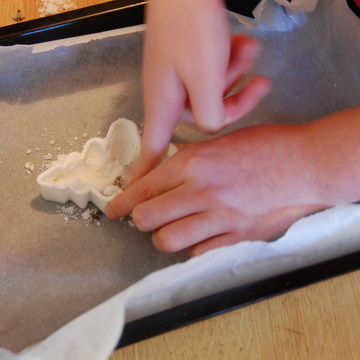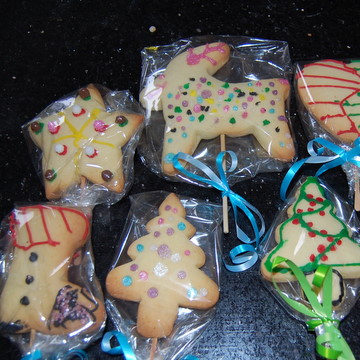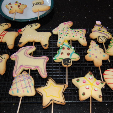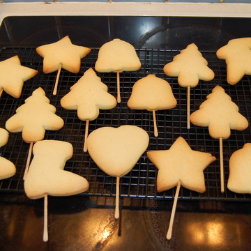 This makes 30 or so biscuits 175g unsalted butter 200g caster sugar 2 large eggs 1 tsp vanilla extract 400g plain flour 1 tsp baking powder 1 tsp salt Cream the butter and sugar until pale and fluffy, beat in eggs and vanilla extract. Mix the flour, baking powder and salt in another bowl, then add the dry ingredients to the butter mixture, mixing well to make a dough. Divide dough into two balls, wrap each in cling-film and place in the fridge for at least an hour (you can freeze one half for use later). Roll out on a floured board to about ¾ to 1 centimetre thick, and cut out in seasonal shapes. Place a wooden stick carefully into each biscuit, then lay on a baking sheet covered with lightly floured greaseproof paper, and cook at 180ºC for about 10 to 14 minutes. When cool, decorate as above. 6th Dec 2008