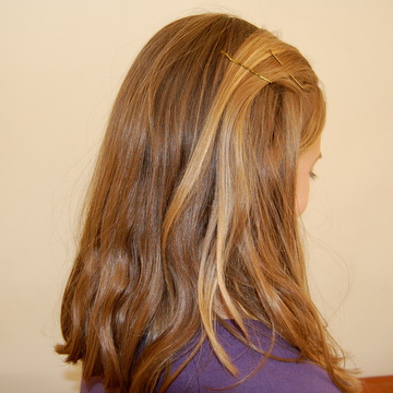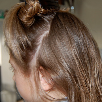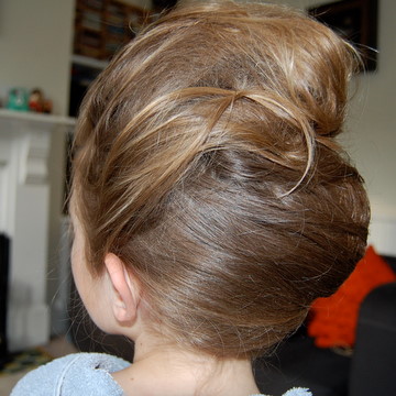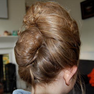To make the beehive, my mum put styling lotion in first, then she made a parting across the top of my head from ear to ear. She pinned the front half out of the way, and backcombed the other half so it was really bushy. She twisted it upwards, pinning it in place on the back of my head, leaving a little pony tail sticking out of the top. She then pinned the doughnut on top of my head to cover the little pony tail bit.