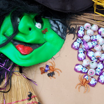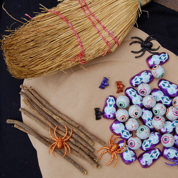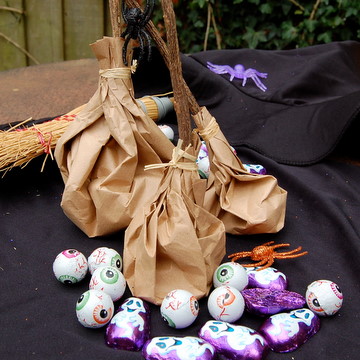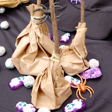Jane: Here’s a funky way to dispense treats to trick ‘n’ treaters this Halloween – fill up a miniature witches’ broomstick with sweets. The brooms take just a minute to make: all you need is some brown paper, liquorice roots for the handles – they look wobbly and knobbly and very authentic (you can buy them in health food shops) – or just use twigs instead, some chocs or sweets, and a bit of raffia or thread to tie the broomstick together.