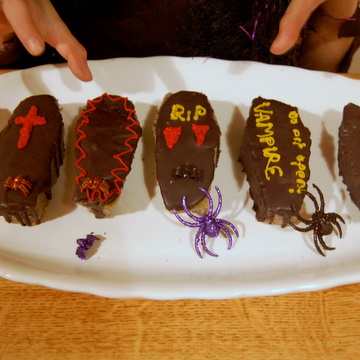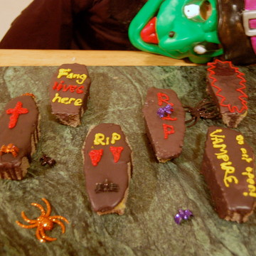 Then we wrote on them with coloured icing tubes – things like ‘RIP’, ‘Vampire – do not open!’, and ‘Fang lives here’. Once they were finished, we ate them. They tasted spookily great!
