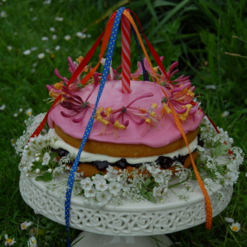 Somehow we arrived at Bircham Windmill too early (or perhaps too late) for the May Day maypole dancing, so when we got home I made a consolatory maypole cake instead. It's a basic Victoria sponge, the middle sandwiched with cream and red fruity jam, and the top decorated with pink butter icing. A striped candy stick in the middle of the cake is the maypole, and I cut lengths of thin ribbon and stuck them (using edible glue, though a blob of icing will do) to the top of the candy stick, twirling them out towards the edge of the cake. The children picked some dark pink honeysuckle flowers and white cow parsley and to put around the edge of the plate giving a flowery feel to honour the spirit of the day. It went down consolingly well. It's nice to be back in summer. Tamsin