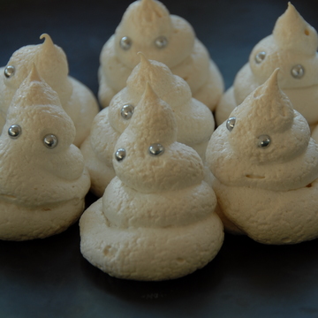 Jane: The ghostly meringue banshees went down so well with trick or treaters last Halloween that I thought I'd make a similar version on a devilish theme this year. The devil meringue had to be red, with diabolical horns, a fiendish mouth and an evil expression (sadly, I knew cloven hoofs and a devil's fork were way too ambitious for the medium of meringue). In the end, even 'red' turned into a bit of challenge. I made the meringue as normal (for instructions see meringue banshees) and at the last minute added my red food colouring. The mixture turned a light pink. I added some more colouring, it turned a slightly darker pink. I could see that if I added the 2 or 3 teaspoonfuls needed to make the mixture a deep and bloody red, the meringue would be so sloppy it wouldn't hold the devil shape. So the devil became pink (hope he didn't mind).