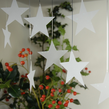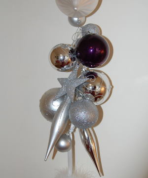 Edie: My sister and I decided to make two big bunches of baubles to hang on our walls. My mum went to John Lewis and bought a box of 100 silver baubles (Jane: reduced to half price – hurry!) and some big fancy baubles too. We got some silver beading wire and started to thread the baubles and stars on to it. Once we had put on lots of baubles, and one coloured one, we twirled the end of the wire and twisted white ribbon on to which we hung our finest bauble so it dangled below.