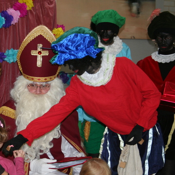 Nienke: Every year on 5 December, Dutch children (even those living in Britain) are lucky enough to receive presents from St Nicholas, a bishop dressed traditionally in sumptuous red robes and a beribboned mitre with crucifix. St Nicholas arrives several weeks before the big day, having come all the way from Spain on a steamboat, accompanied by a troop of ‘Black Peters’, his colourfully dressed and antic-loving helpers.