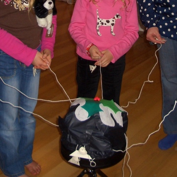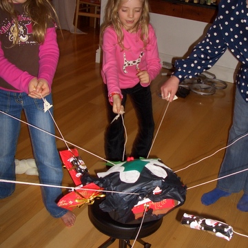 The other end of the string is attached to a wrapped present that’s been hidden in a paper and cardboard construction. The gifts inside the Puller are only small: last year I got chocolate bars, the year before some cheap CDs, and the year before that bath products.