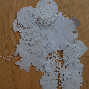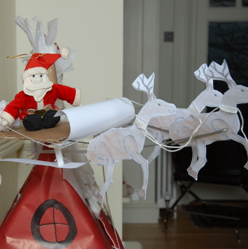 Sometimes the simplest ideas work best. One year the children spent a whole day making hundreds of cut-out snowflakes that we hung on string and used as paper chains. Apart from the large amount of hoovering that had to be done afterwards this was a great excitement-consuming activity. Another simple idea was to get them to draw a motif for each door in the house – snowmen, Father Christmas, Rudolfs and so on were cut out and stuck to each door. Paper chains and holly and ivy are a must for the house and one of my favourites are the crêpe paper ones. There is something wonderful about repetitively folding paper and ending up with a multi-coloured streamer after one simple pull of the finished folds.