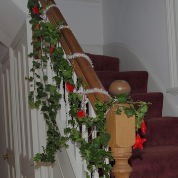 Greenery takes pride of place in my house too, with sprigs of holly and ivy on top of every mirror or picture frame. Usually I make a swag to go around the stair rail, but this year I ran out of energy so with a house full of guests about to view Christmas efforts I twisted tinsel and hung cascading branches of ivy from the banister instead – easily worth the 10 minutes work.