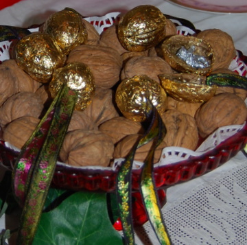 But I also love homemade decorations. My mother still has ours. The singing angel, the flying pig made from corks and painted pink, even the tiny medicine bottles that were sprayed gold one year as a substitute for baubles. This year I finally got round to making an idea I’d read about in a book on the traditions of Victorian Christmas – Gilded Walnuts, hollowed out, hiding a tiny treat and hung on the tree or placed in a bowl of nuts at the table.