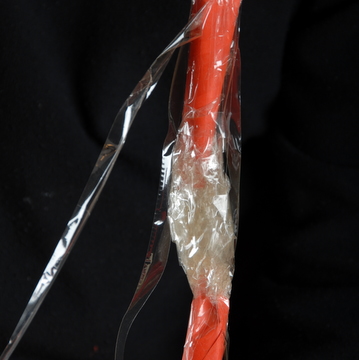 Then grab the edges of the paper and gather them together at the top. Shake the sweets down and push on a table to give the broomstick a flat bottom, so it will stand upright. Stick one end of a liquorice root in the centre of the gathered paper, about 2-3 cm deep, then secure around the paper and root with a bit of raffia or thread.