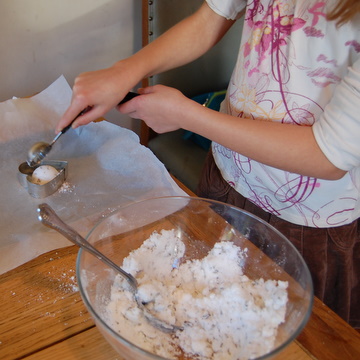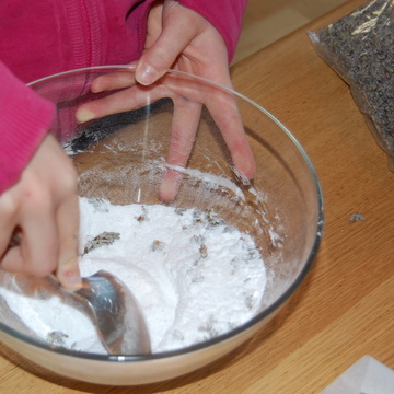 The bombs are quick and easy to make – though take 12 hours to dry – and look very seasonal made in the shapes of Christmas trees and hearts, then wrapped in cellophane and ribbons. They’re exciting to use too: when you drop one in your bath it fizzes and twirls like a Catherine wheel, releasing its skin-soothing oils and fragrance for a good soak. All you need are a couple of packets of citric acid (from chemists), bicarbonate of soda and vegetable oil (we used sunflower but almond and olive are lovely on the skin). We added some dried lavender flowers (or you can use any fragrant essential oil you like) and a bit of colouring too. In a dry glass bowl, measure out 1 part citric acid to 2 parts bicarbonate of soda. Stir gently but thoroughly with a metal spoon – the mix is quite potent and can make you sneeze so stand back while stirring.