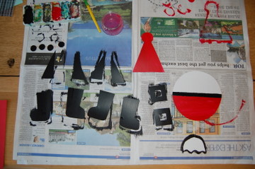 out the paints: paint the boots, buckles, four pupils and arms black. Paint the