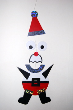 Hanging Santa is easy to make, once you’ve cut out the shapes, but he does take a bit of faffing-around time to let paint dry etc. All you need (that famous phrase) is a piece of white cardboard, some zany metallic card for decoration (or use cotton wool instead), black and red paints, glue, a needle and white thread. First draw
