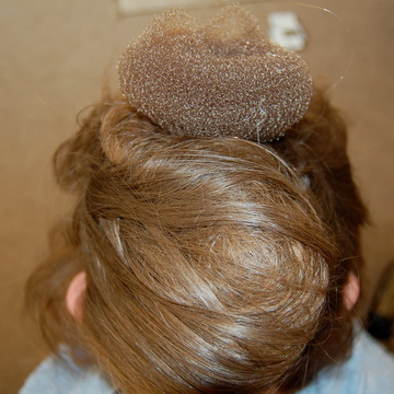 She backcombed the front half of my hair next. She did this a lot, so it stood up nicely. Then she twisted this upwards and backwards over the doughnut, tucking it in with hair pins so it stood up high. Then she sprayed loads of smelly hairspray over the whole thing.