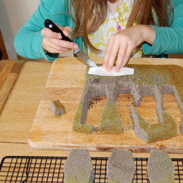 Then we drew a coffin-shaped template out of cardboard, and cut it out. I put the template on the cake, got a knife and cut around it six times to make six coffins. (There was quite a lot of cake left over, but we ate it!)