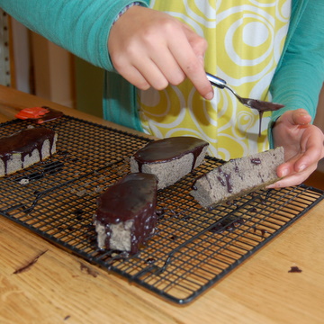 Next we made some black glacé icing (which did turn out black) and spooned it over the top of the coffins, so it dripped down the sides. They did actually look like coffins.