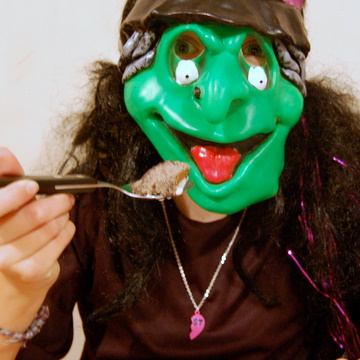 On a sheet of greaseproof paper, I whirled spoonfuls of pink meringue to try and create a devil shape. The floppy mixture wouldn't quite hold and kept squidging out sideways, getting fatter and fatter as I added more for height. Still, fat devils can be fiendish too. I shaped two crescent horns using a straw, whirled some eyes, and drew a long downturned mouth. Then I shoved the little monster in the oven to crisp up. I had a peek about an hour in and the devil was frothing red blood (the colouring) from the gash of his mouth – marvellously gruesome. I left overnight hoping the blood would solidify creating a truly scary sight. In the end, there was just a dribble of blood, but the devil looked rather splendid as though he'd been on a three-day eating and drinking orgy, his horns slightly bashed and with a rueful but still devilish expression on his face. 27th Oct 2008