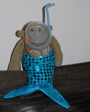 I have now finished my underwater clothing for my PG Tips monkey. I decided to do a mermaid with a mask, I don't know why! I made the top out of some shells and string so it looked like a mermaid top. I used to get a magazine that came with small clothes for your toys, and one of them was a mermaid tail. I found the tail and put it on my monkey, then made the mask out of a bit of a drinks bottle and a straw. Soon my mermaid was ready for the fashion show and the superstar life ahead.