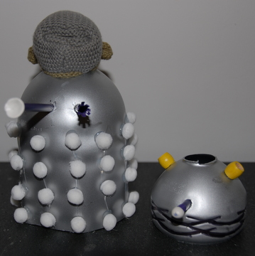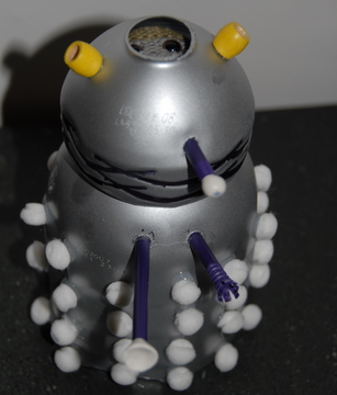 We got some yellow beads and stuck them on for the lights, and straws with plasticine on the ends for its weapons. We found some old Christmas decorations with white pom-poms and stuck them on the body. We put Monkey inside and he was ready to EXTERMINATE, EXTERMINATE. Carla