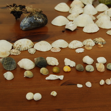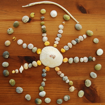 It's half-term and we're on a quiet Scottish island where the sand is white, the sea is deep turquoise, and the beaches are full of shells of incredible shapes and colours. We're staying in a house with shell art on the walls and a beach 20m away, so decided to see what we could find in a couple of hours' beachcombing. Everyone took a bag and picked up the shells they liked best, then brought them home and laid them out on the table to make instant homemade art. Carla arranged hers in the shape of a wheel, and also found a pipefish, which used to be rare but you see more often now...