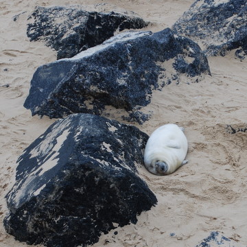 After the initial surprise has worn off the group is aghast, but luckily they can climb to the top of the embankment to view the seals. Once the likely looking people in fluorescent jackets have been queried about the extent of the closure, and following the discovery that the nearest stretch of free beach is a six mile walk away, it is decided that the only thing to do to escape the hordes is to continue walking along the bank. The group eventually comes to rest in an isolated hollow, with a perfect view of the seals. It is now that the secret weapon is revealed. The rucksacks are opened to reveal a small gas cooker, hotdogs, white finger rolls and assorted condiments – the perfect lunch. Whilst the sausages are bubbling away, the group turns to seal watching. There are many of them, ranging from teeny white, fluffy babies to huge (and I mean really big!) adults. Their entire life seems to consist of sleeping, only ever moving to get comfortable.
