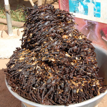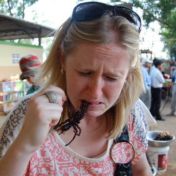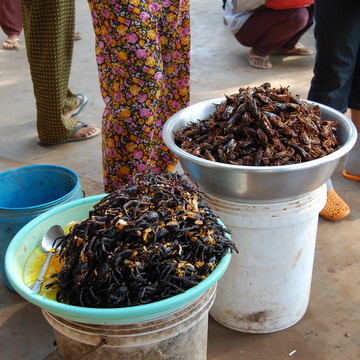 Jane: I’m always keen to try weird and wacky foods, thanks mostly to my dad, who encouraged us to get to grips with snails, liver and frog’s legs by the age of about eight. But on a recent trip to Cambodia, the concept of wacky gastronomy hit a new high (or low, depending on the strength of your stomach). To wit, tarantulas. You can see them in the picture above, piled up in a country market stall near the jungle, several hours’ drive from the capital city of Phnom Penh. Would you eat these? Thought not. But two of us with more hair than sense decided we must, just must, have a taste to show we’ve walked on the wild and jungly side and lived to tell the tale. Well, let me tell you, spiders taste foul. We took one off the top of the big pile. It was black and shiny, fried in oil. (One man told us they pull out the poison sac and fangs before you eat them which was some comfort, and apparently tarantulas are not really poisonous anyway, they just look it.) We both chewed a leg (not the same one). It was tough and fibrous. With an oily aftertaste. I spat it out and gave up.