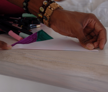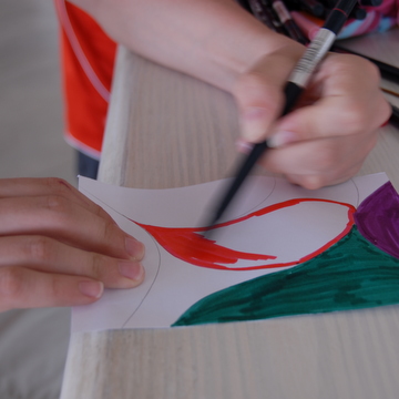 Jane: Forget about buying expensive kites – today with the help of Alex, who’s been making kites since he was a kid, we learnt how to make an excellent kite from scratch using a bit of paper, some cotton, a couple of wooden kebab sticks and a few old plastic bags. It is pretty easy. First the kids cut out a small rectangular bit of paper each, and drew a design of their choice on each one.