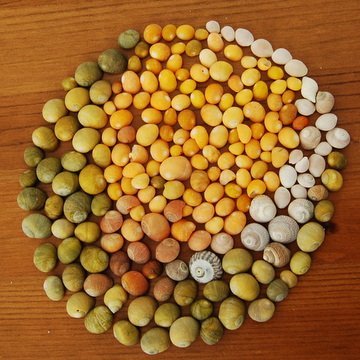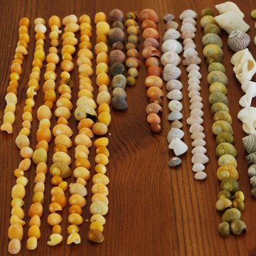 Mike collected tiny yellow and green flat periwinkles and packed them into a circle...