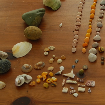 Tamsin picked periwinkles of all colours, plus some white cowries, and arranged them in bold lines of colour...
