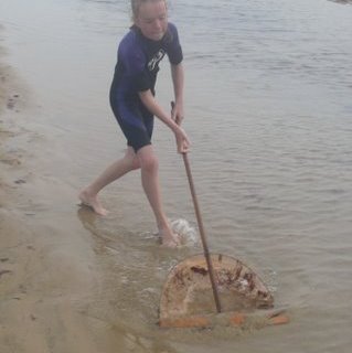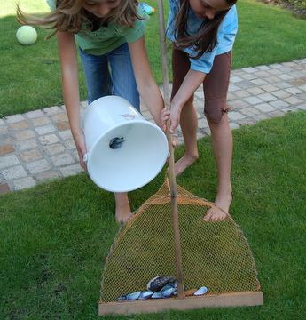 Collect the shrimp in buckets as shown here (Millie and Edie are practising their mussel technique in the garden)…