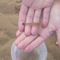 You can see Jasmin holding a brown shrimp, a wiggly translucent thing…