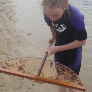 The net is a good solid one with a flat edge at the bottom which you push along the seabed in a few inches of water when the tide has gone out, as shown above. The shrimp, tiny flatfish, starfish, crabs and loads of other kinds of marine life are scooped into the net.