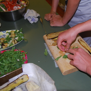For those of us who were a bit more squeamish, there were plenty of other jobs and we all found our niche. Carla concentrated on pudding (her favourite), Emma and Andrew the mayonnaise and salads, Mike the aubergine rolls and Nienke the fiddly vegetables.