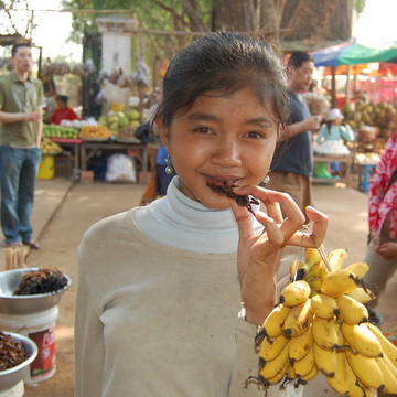 In Cambodia, our guide explained, they eat everything except the table and he wasn’t joking. In the next basket were grasshoppers, and we saw big red ants – the stir-fried eggs are considered a special treat. This ‘if it moves, eat it’ philosophy is partly a legacy from the days of the Khmer Rouge, when people were starving and would eat anything from tree bark to flying insects to stay alive. Nowadays, people aged 40 and over who lived through the 1975-79 Pol Pot atrocities often have terrible stomach and digestive problems, and one of the things they take for it is spider whisky in which tarantulas (and sometimes ants, for the formic acid) are steeped to make a strong medicinal tincture. Apparently spider whisky is good for bad backs too.