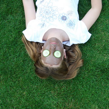 face pack and cucumber slices over her eyes, looking trendy but tranquil,