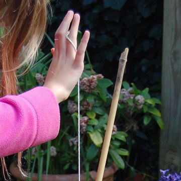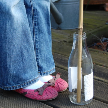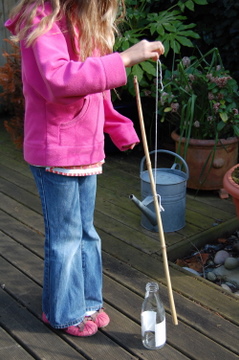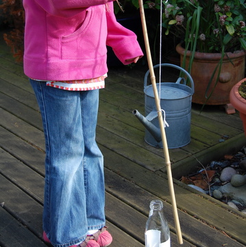 We choose an elderflower cordial bottle with a wide neck (rather than a narrow milk bottle) to maximise our chances, and dug out a piece of old bamboo garden cane from the shed. The idea is to tie the string exactly in the middle of the cane, so it doesn’t naturally tilt down at one end. I tied Edie’s index finger tightly on to the other end of the string, then checked my watch and timed how long she took to get the rod into the bottle.