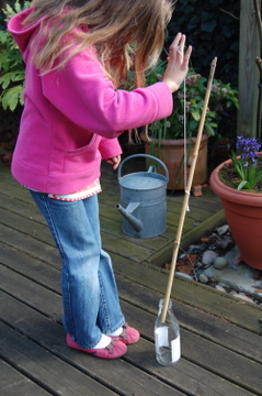Jane: Today Edie and I braved the bright blue chill of outdoors to play a game called Stick & Bottle. The game came from a 1960s’ party book and looked easy, we thought, until we started playing it. It was a gusty day, which I wouldn’t mention except when you’re trying to ease a long stick hanging from a string into the narrow neck of a glass bottle, every little whimper of wind can send you askew.
